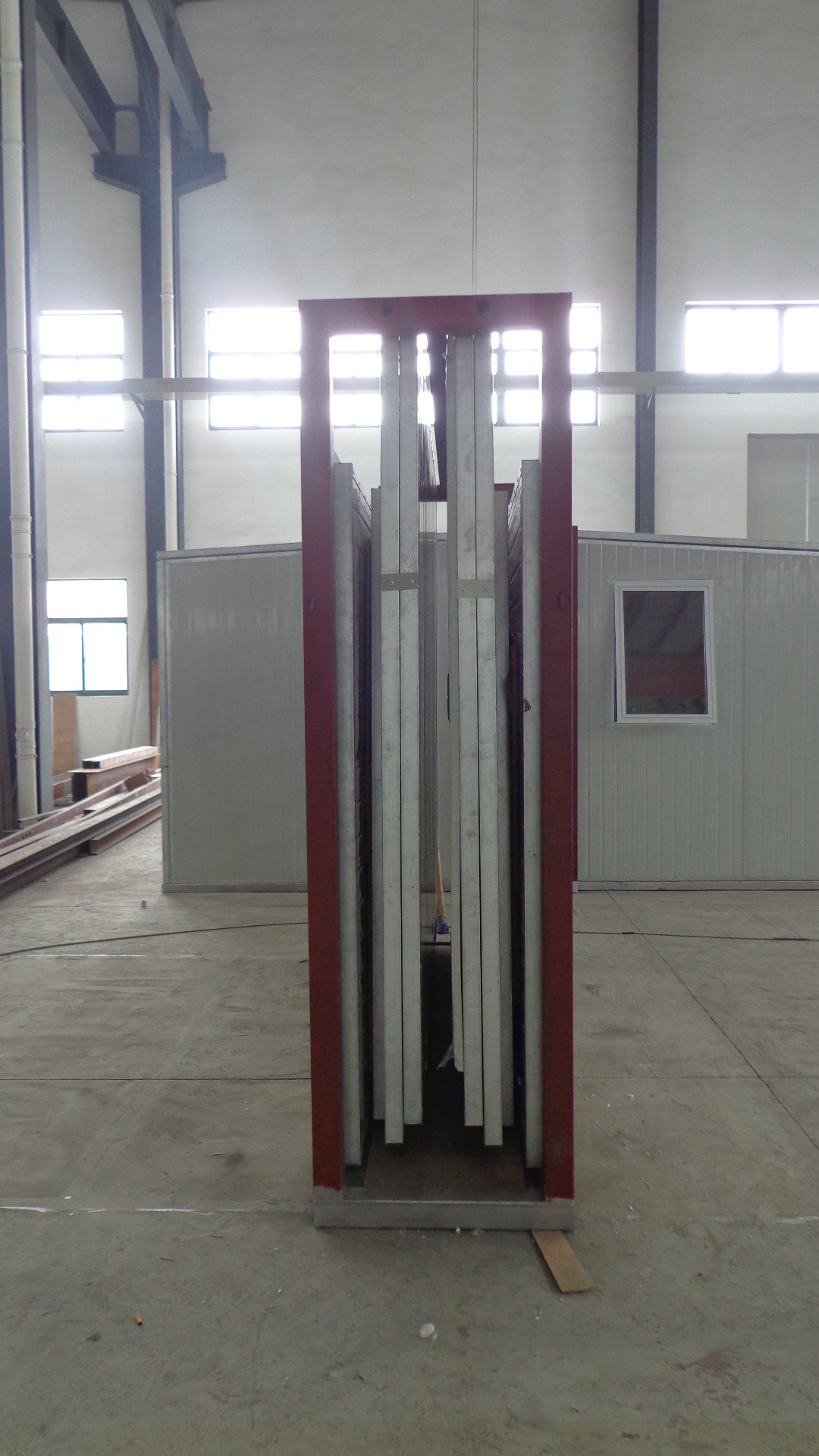 I pannelli murali sono realizzati con un pannello sandwich in schiuma EPS da 50 mm con una densità di 10 kg. Tutti i pannelli sono fissati in fabbrica e incernierati con il pannello di copertura. Lo spessore dell'acciaio per il pannello è di 0,35 mm all'esterno e 0,35 mm all'interno.