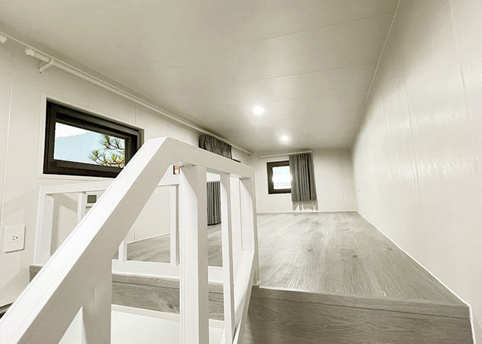 L'accesso al loft principale è facile grazie alle saggiamente progettate scale che fungono da scompartimenti di stoccaggio, massimizzando lo spazio disponibile.4 m e dimensioni interne di 2.08 x 7.05m, la Cider Box Tiny House raggiunge un equilibrio ideale tra compattezza e spaziosità, rendendola una scelta eccellente per vari luoghi e stili di vita.