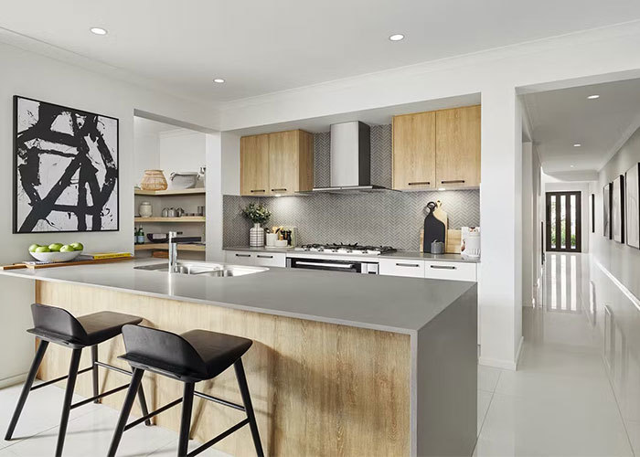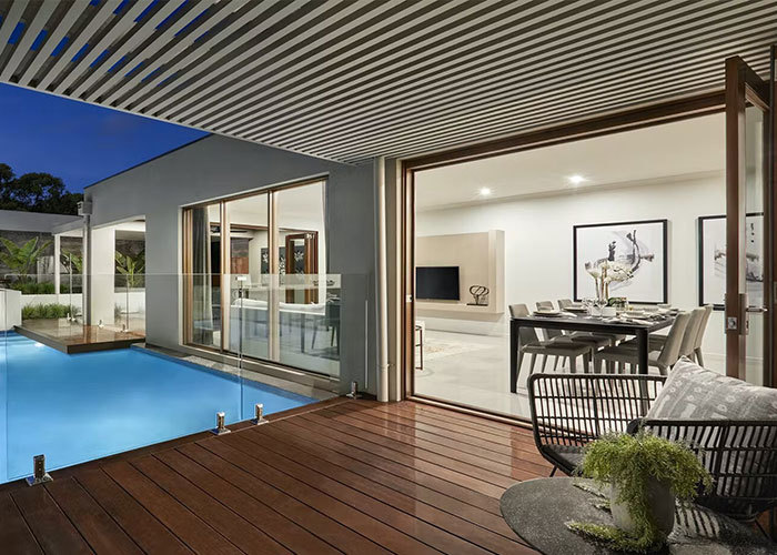 Il centro della casa si apre in una cucina aperta connessa alla sala da pranzo.con un flusso facile che si adatta sia alle routine quotidiane che alle riunioni con amici o familiariDalla sala da pranzo, grandi porte scorrevoli in alluminio conducono direttamente a una stanza esterna, estendendo lo spazio abitativo all'aperto e creando una transizione agevole tra la vita interna e esterna.